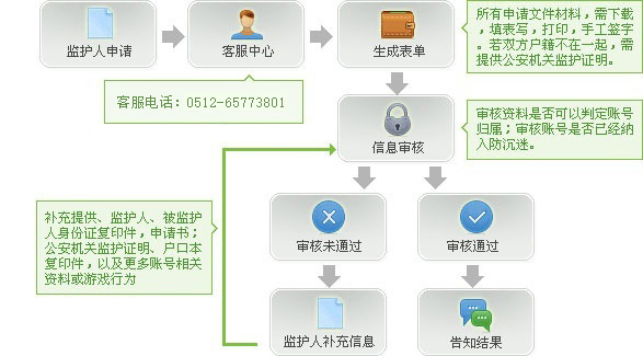 家长监护系统充分考虑家长的实际需求,当家长发现自己的孩子玩游戏过于沉迷的时候,由家长提供合法的监护人资质证明、游戏名称账号、以及家长对于限制强度的愿望等信息,可对处于孩子游戏沉迷状态的账号采取几种限制措施,解决未成年人沉迷网游的不良现象,如限制孩子每天玩游戏的时间区间和长度,也可以限制只有周末才可以游戏,或者完全禁止。
